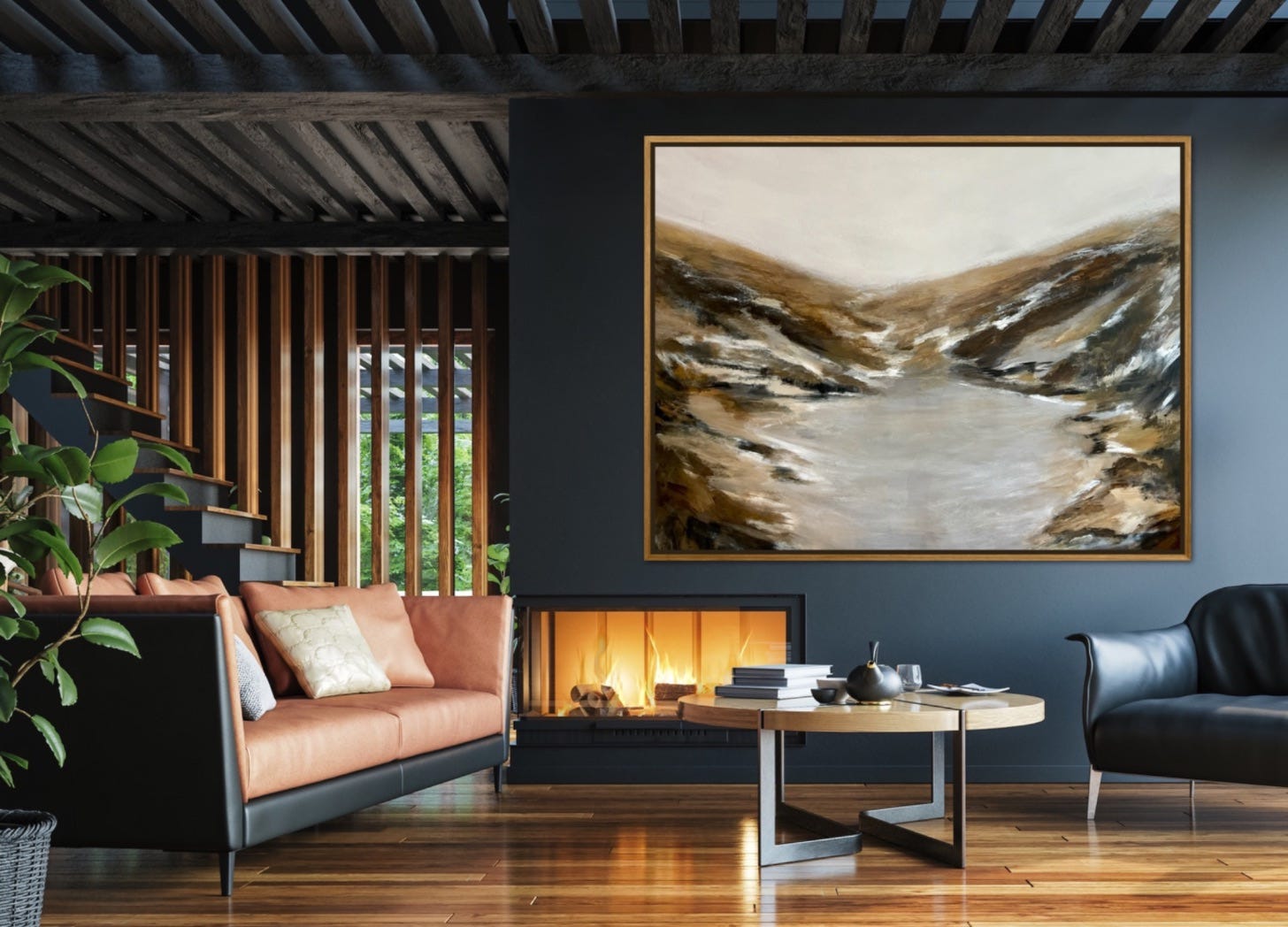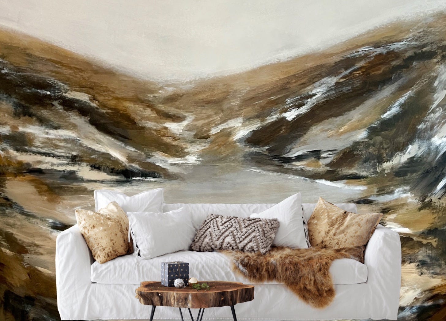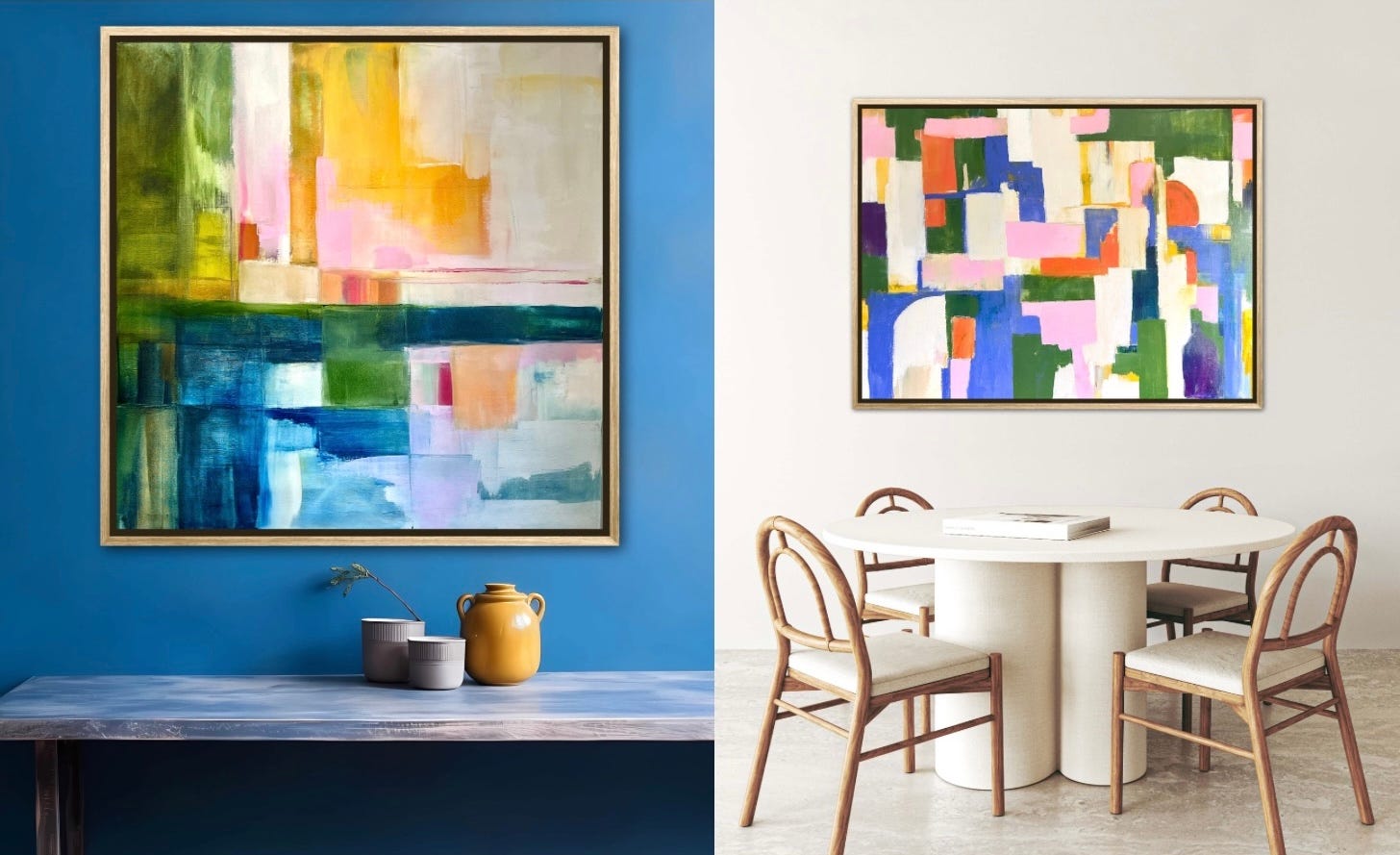 I’ve completed the abstract landscape that I’ve been working on (Wintering, approximately 48H x 60W inches) and have submitted it for wall covering licensing consideration. Here’s my mock-up.